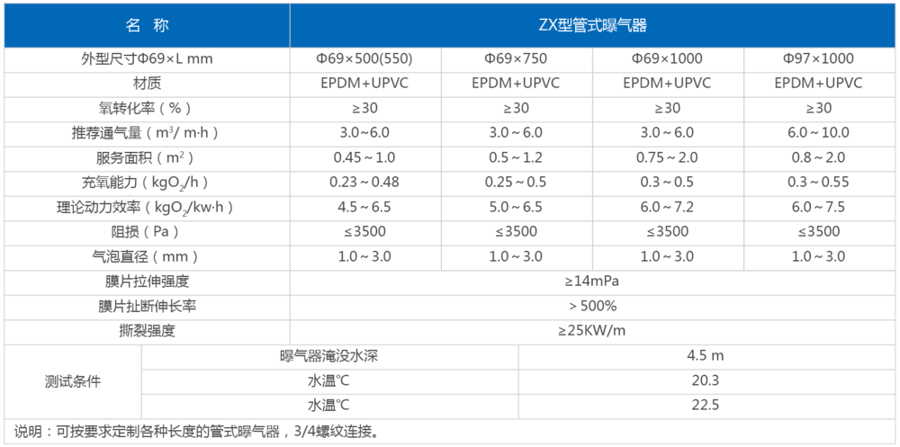 ZX type tubular aerator specification 1: the outer diameter is Ф69, the length is 500mm, 550mm, 1000mm, 2000mm;
